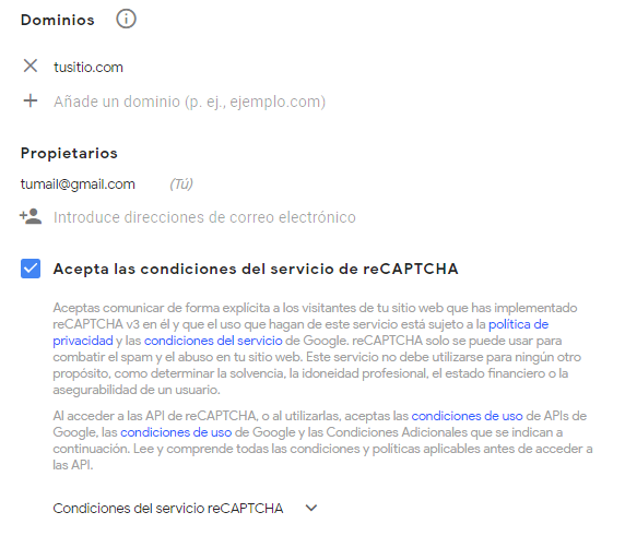 Retomando.. Agrega el o los dominios en los cuales utilizarás la función de reCaptcha y acepta las condiciones.